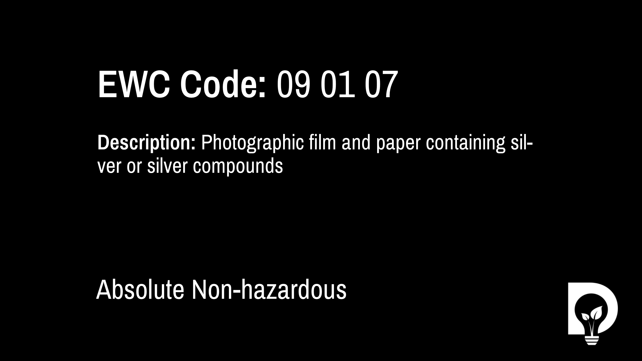 European Waste Catalogue (EWC) Code 09 01 07 describes waste that as photographic film and paper containing silver or silver compounds and is classed as a Absolute Non-hazardous code.